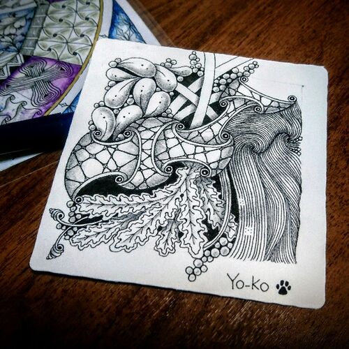 スピナーを使って、久しぶりに白黒のトラディショナルを描きました。 ストリングは8の字みたいな感じにしました。何を描こうか迷う時スピナーは便利です。いくつかのセクションに分かれていて、その中から好きなタングルを選ぶ事が出来ます。ピンとこなけれ…