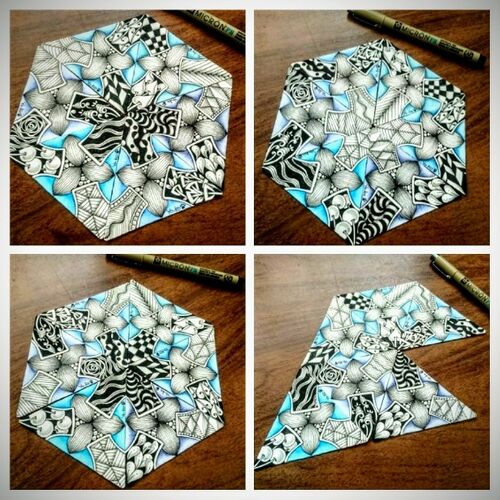 先日のストリング入りの3zタイルが完成したのでモザイクしました。 6枚で六角形にすると、真ん中に星みたいな形が出来上がります。メリハリつける為に2ヶ所黒っぽいタングルと1ヶ所白っぽいタングルに分けました。テーマ別に分けてた場所があべこべになって…