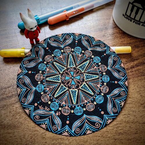 マンダラ描くのにはまっています。 特に難しい柄を描かなくても出来上がります。 このマンダラもゼンタングルと同じで、・−C○Sの繰り返しで描いてあります。 ️ サーキタル100日チャレンジ4日目 黒タイルに描きました。 ゼンタングルのレッスンについて質問…