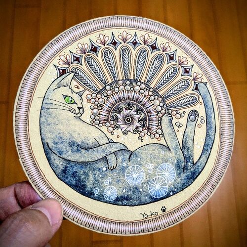 ご訪問ありがとうございます ゼンタングル認定講師の中嶋洋子です レッスンの詳しい内容はこちらをご覧下さい ︙ 夏から寝ていた猫を起こしたら、初日の出みたいになりました。 夏の時はひまわりみたいにしようかと思っていました。時間が経つと描きたいもの…