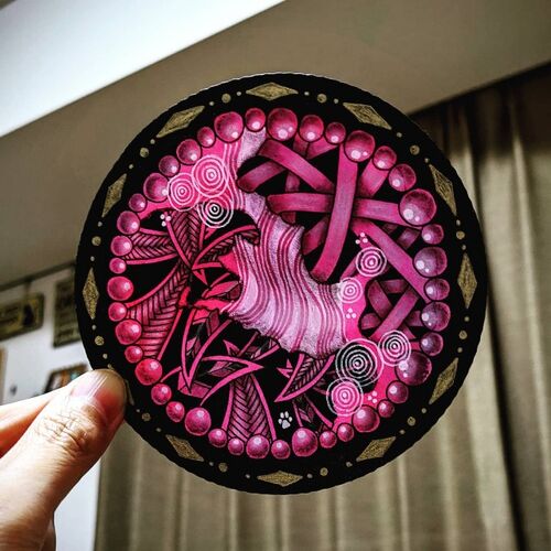 ご訪問ありがとうございます ゼンタングル認定講師の中嶋洋子です レッスの詳しい内容はこちらをご覧下さい ︙ 赤で濃い目に染めたタイルに描きました。 滲みをストリングにして真ん中を残すつもりでいたのについつい白ペンで描き込んでしまいました。 悪い…