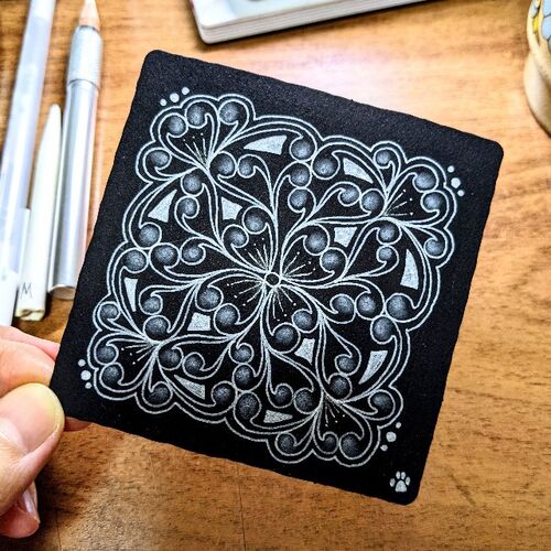 ご訪問ありがとうございます ゼンタングル認定講師の中嶋洋子です レッスの詳しい内容はこちらをご覧下さい ︙ 先日、黒タイルにモノタングルで花みたいなのを描いたのですが、今回もまた黒タイルにモノタングルで描きました。 ムーカだけで描きました。真ん…