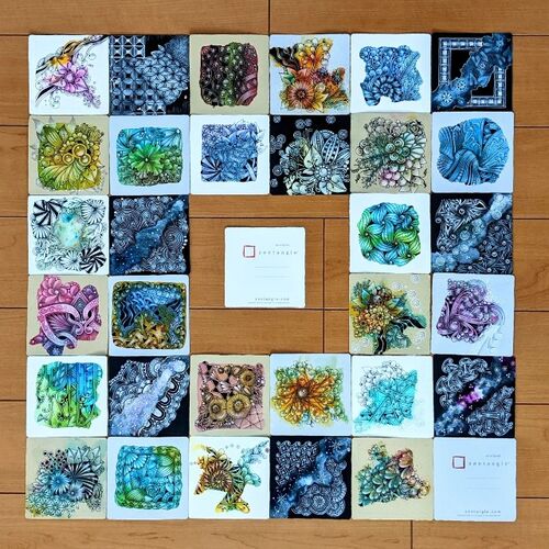 ご訪問ありがとうございます ゼンタングル認定講師の中嶋洋子です レッスの詳しい内容はこちらをご覧下さい ︙ 今回は青が多めです。グレーのタイルに青と黄色の組み合わせがキレイだなぁと思いました。 黒タイルへの染め方については自己流です。白のインク…