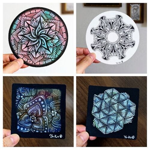 ご訪問ありがとうございます ゼンタングル認定講師の中嶋洋子です レッスの詳しい内容はこちらをご覧下さい ︙ 毎日チャレンジの他にチマチマと描いています。 左上のステンドグラスみたいなのはストリングが描かれているゼンダラを染めたものです。金と銀の…