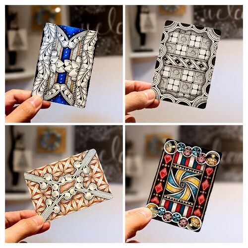 ご訪問ありがとうございます ゼンタングル認定講師の中嶋洋子です ゼンタングルの楽しさを広められたらと思い日々描いた作品をアップしております ︙ 着色楽しいです。ブラシタイプの水彩ペンを使っています。 左上は門をイメージしました。 右上は基本のレ…