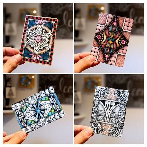 ご訪問ありがとうございます ゼンタングル認定講師の中嶋洋子です ゼンタングルの楽しさを広められたらと思い日々描いた作品をアップしております ︙ ATCタイル楽しいですね。 色を塗る為に描くタングルや模様を考えてしまいます。塗り絵の下絵を描いている…