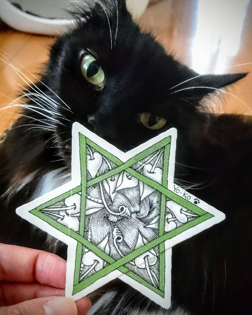 オーラノットというタングルで囲って、星の角からポークリーフを描き、中心はセナで埋めるやり方でした。三角と真ん中の大きな六角形をレティキュラにしてみても面白いかもしれないです。