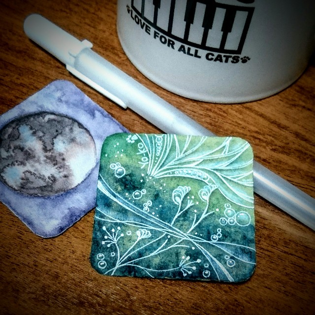 いちばん小さなビジュータイルにジェリーロールの05でタングルというか、線を引いてみました。普段は08を使ってくっきりした白のタングルを描くのですが、今回染めた色の雰囲気だとそれより細いペンが合う感じがします。白く塗りつぶす部分も作らない方が滲みが活かせる感じです。