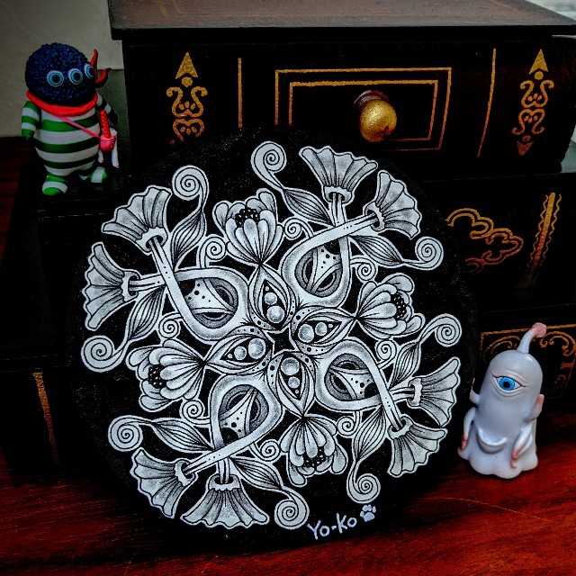 描いてる途中で、目のような部分が顔に見えてきました。タングルでフクロウやイカみたいに見えるやつと同じ感じですね😄じっと見つめられてます。