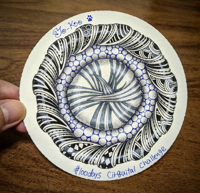 ちなみに、ゼンボタンとは丸いボタンの様な形の中を様々に区切ってタングルを描くというイメージです。シェーディングとハイライトのテクニックで上の画像のような作品が出来上がります!