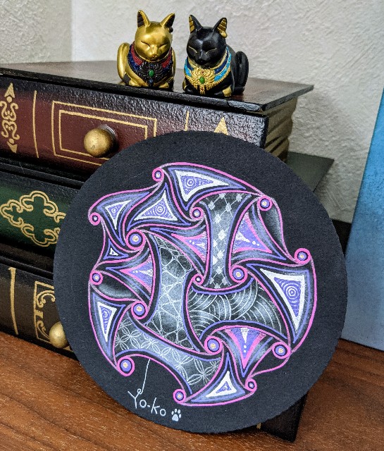 ムーンライトでクレイジーハギンスというタングルを大きく描き、それをレティキュラ(枠組み)にして、中にジェリーロール05でタングルしました。
