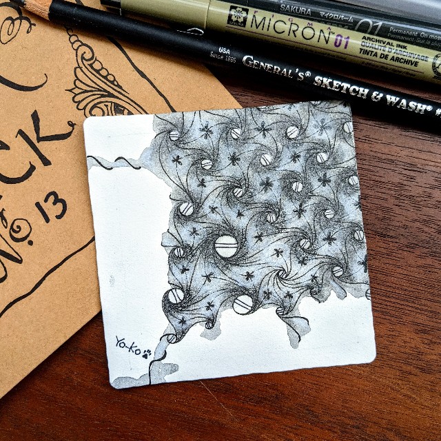 どうなるか分からないけど上からスケッチ&ウォッシュを重ねて塗ればいいか、という軽い気持ちでそのまま進めました。ゼンタングルに間違いは無いという考え方があって良かったです。