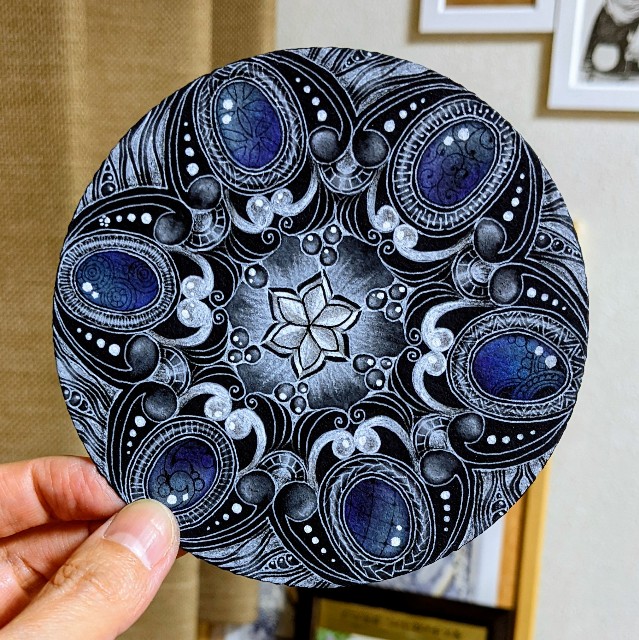 色鉛筆で塗ってからタングルしたのですが少々ペン先が…。チャコの上に描こうとするとペン先が駄目になる感覚と似ています。